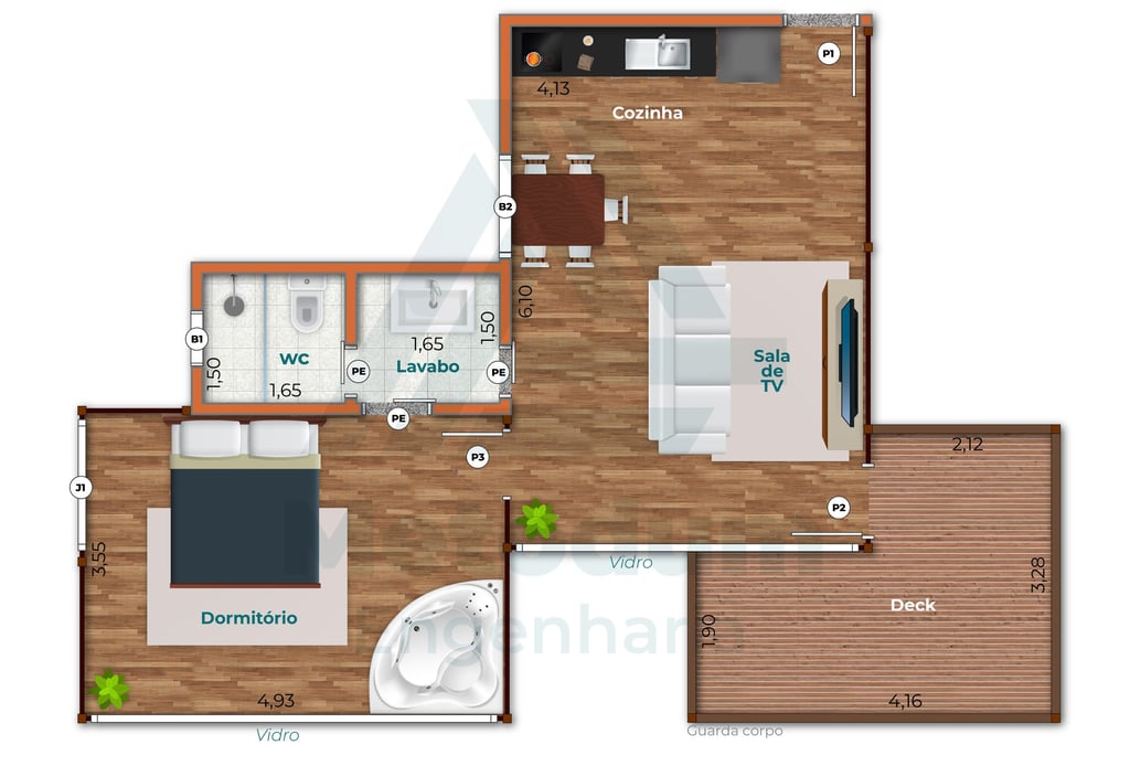 Com 64,81 m², o projeto Fairfield é um chalé moderno e acolhedor, com layout integrado, deck panorâmico e estrutura em madeira nobre, perfeito para áreas de campo, pousadas ou refúgios naturais.