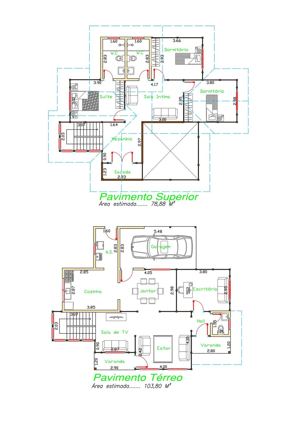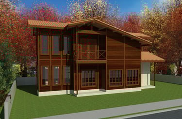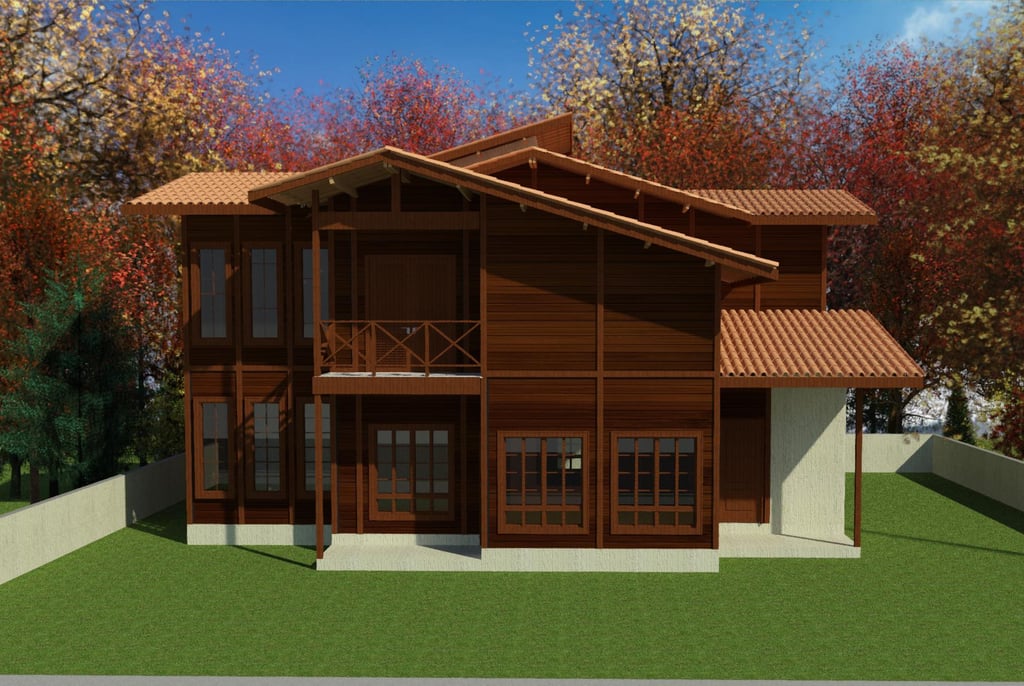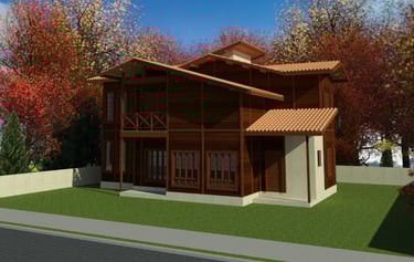 Com 182,68 m², o projeto Carolina do Sul é um sobrado amplo e imponente. Possui três dormitórios, suíte com sala íntima e mezanino, além de escritório e garagem integrada. A estrutura em madeira maciça de Massaranduba garante elegância e durabilidade.