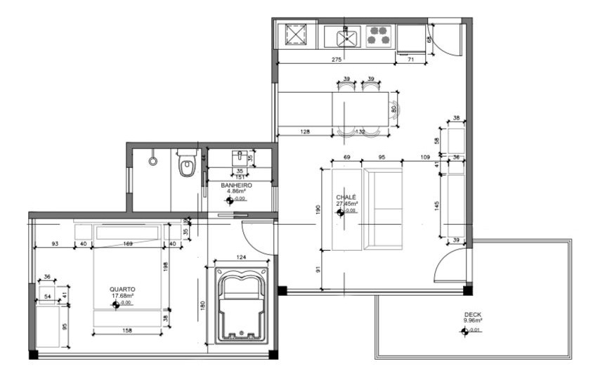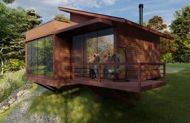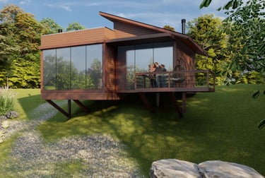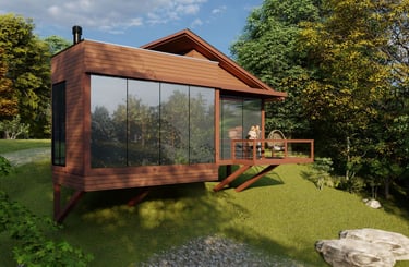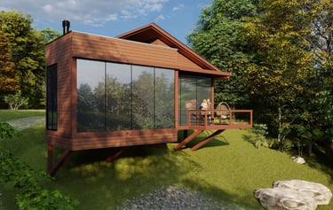 Com 64,81 m², o projeto Fairfield é um chalé moderno e acolhedor, com layout integrado, deck panorâmico e estrutura em madeira nobre, perfeito para áreas de campo, pousadas ou refúgios naturais.