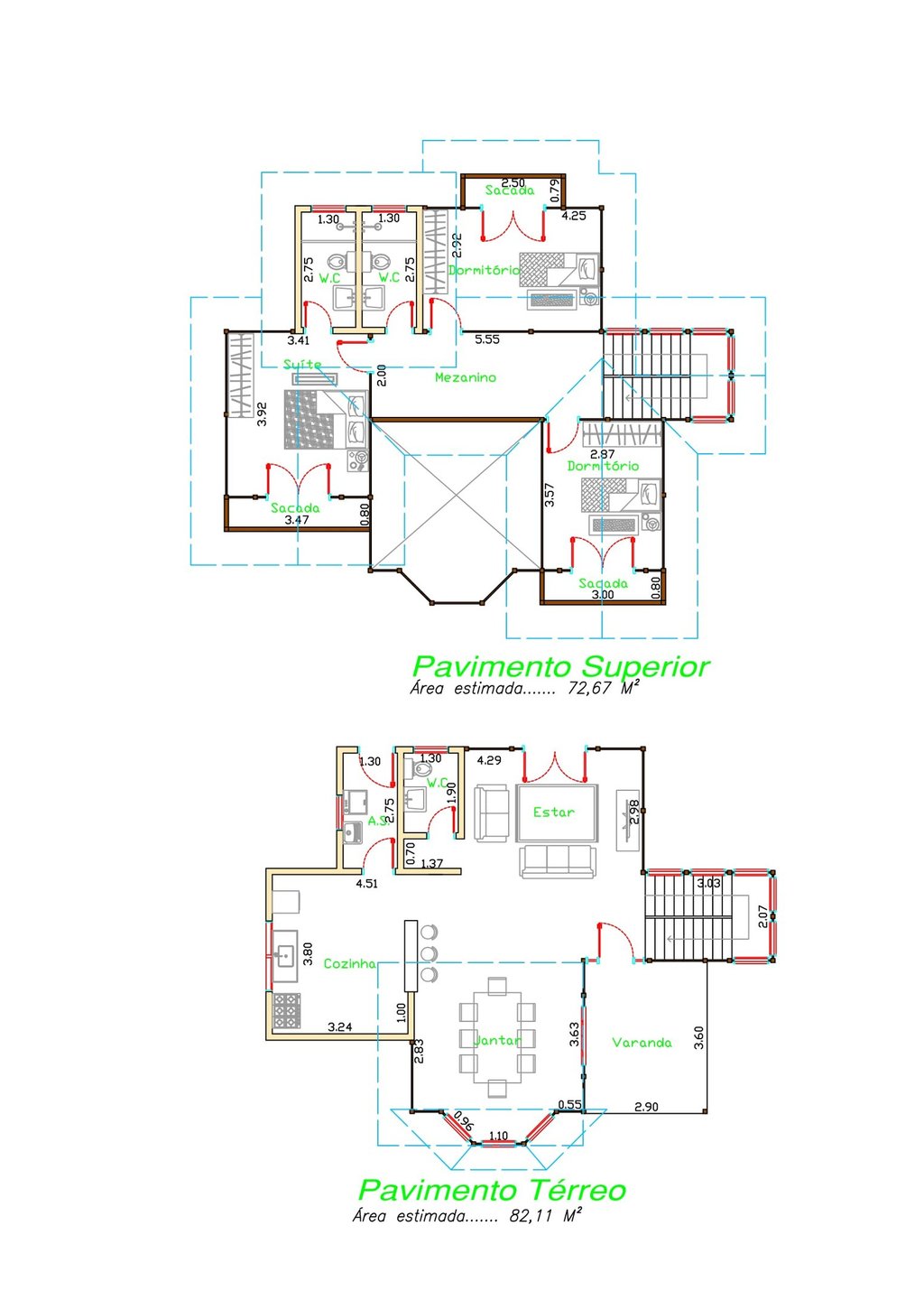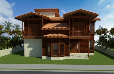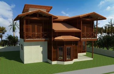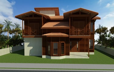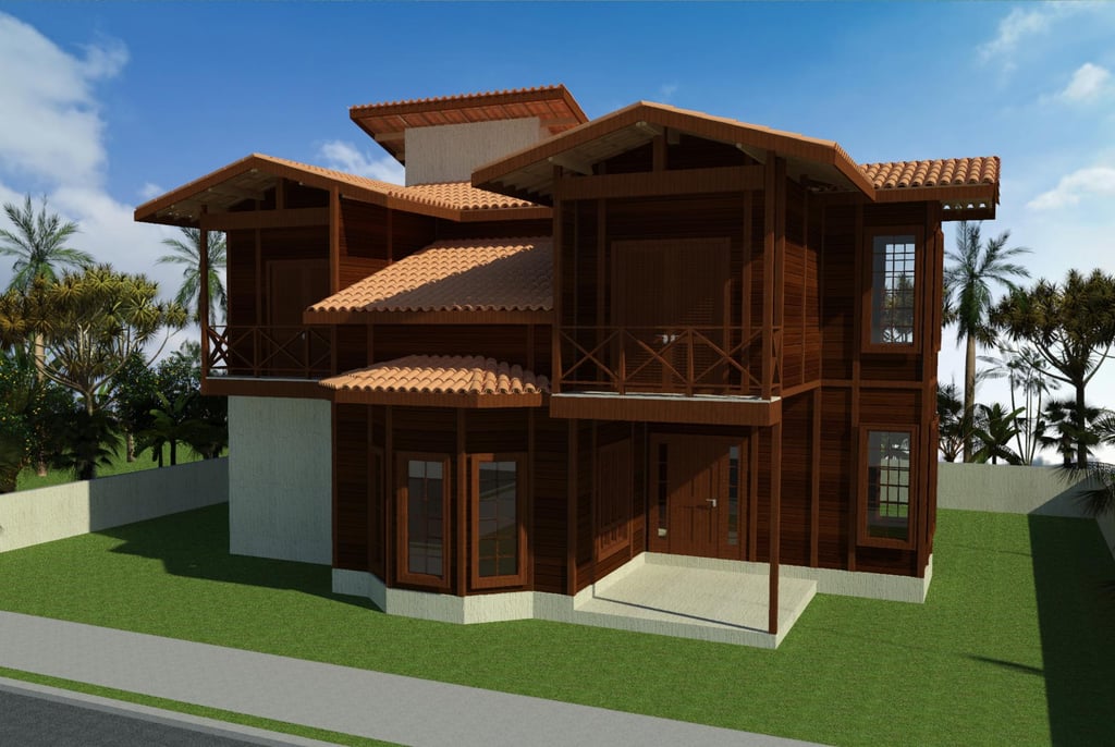 O projeto de casa de madeira Flórida é um sobrado de 158,78 m² com três dormitórios, duas sacadas, mezanino e ampla varanda integrada. Um modelo moderno em madeira maciça de Massaranduba, que une elegância, conforto e alta durabilidade.