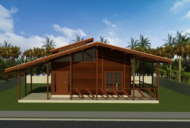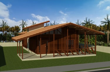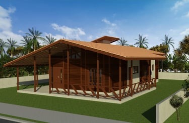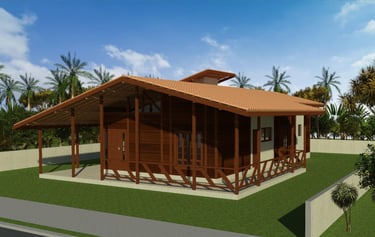 O projeto de casa de madeira Kansas é uma residência térrea de 137,16 m², com três dormitórios, sendo uma suíte, ampla sala integrada à cozinha e jantar, além de varandas e estrutura em madeira maciça de Massaranduba, proporcionando conforto e sofisticação.