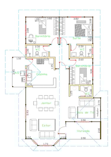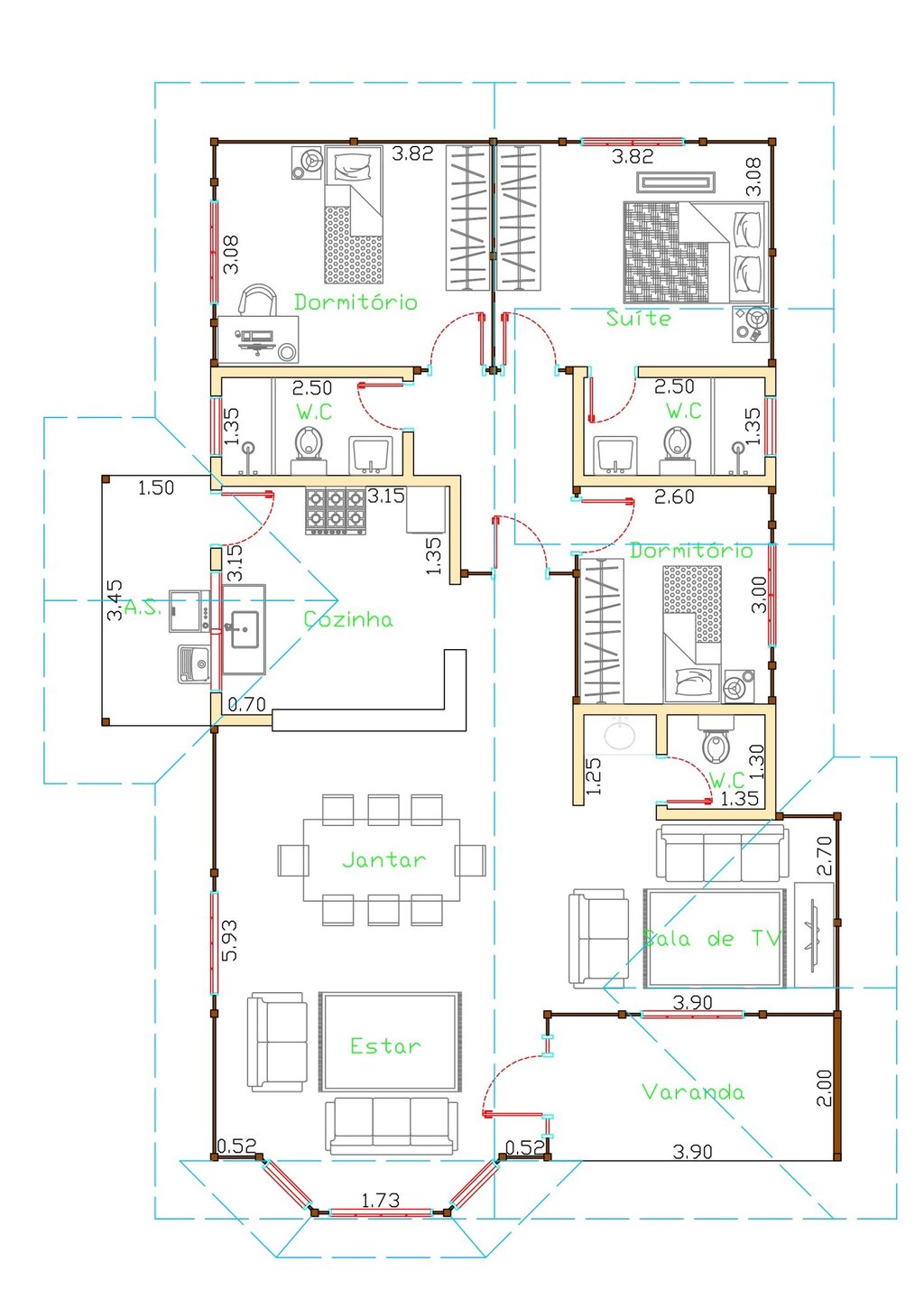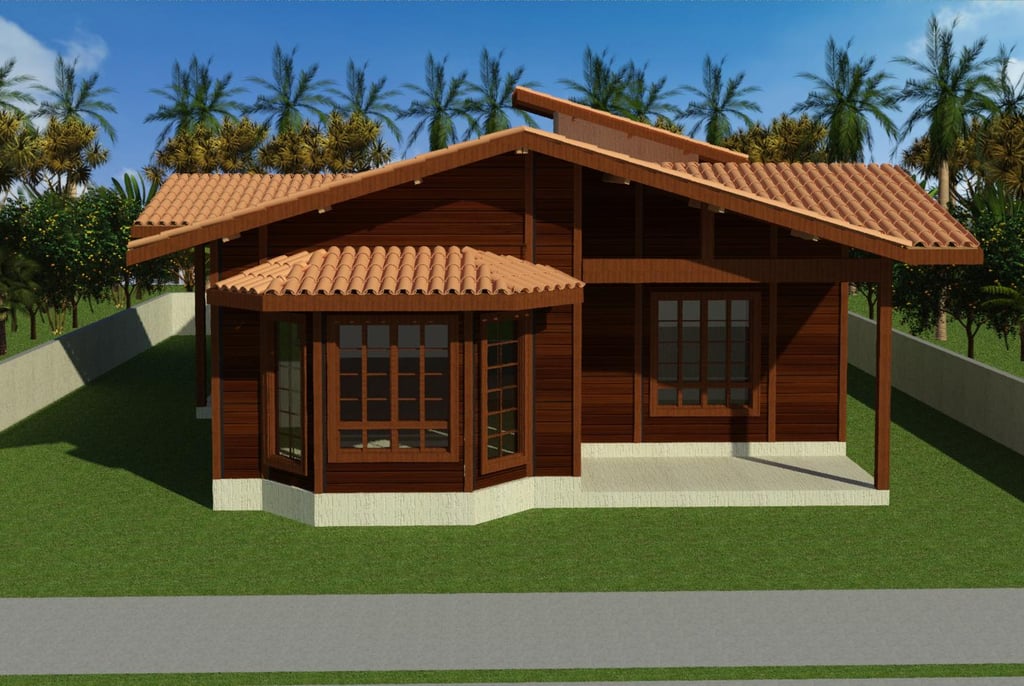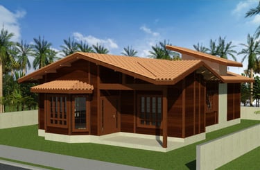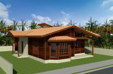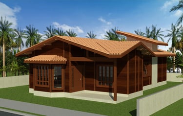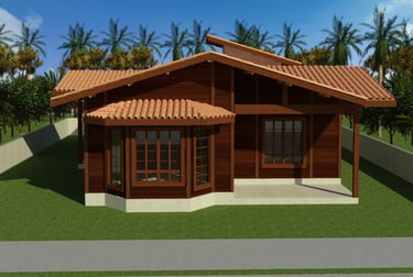 Com 121,53 m², o projeto Mississippi Queen combina estilo e conforto em uma casa térrea elegante. São três dormitórios, incluindo uma suíte, além de sala de TV e jantar integradas. A estrutura em madeira maciça de Massaranduba une charme e resistência.