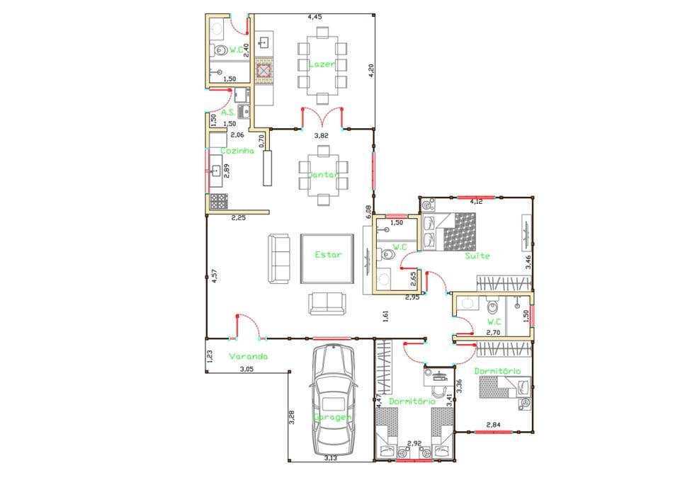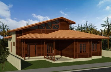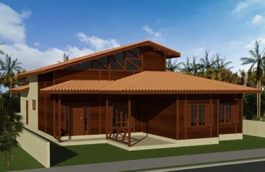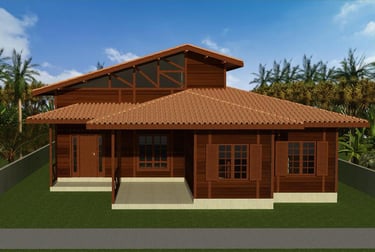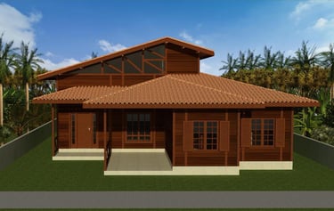 Com 146,53 m², o projeto Omaha é uma casa térrea espaçosa e acolhedora. Possui três dormitórios, sendo uma suíte, garagem integrada e amplas áreas de estar e jantar. A estrutura em madeira maciça de Massaranduba garante conforto, durabilidade e charme atemporal.