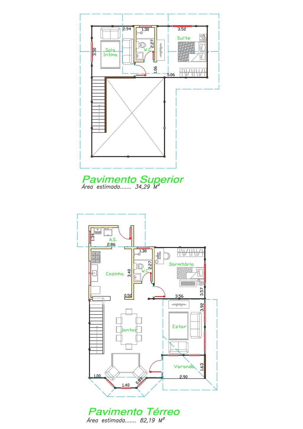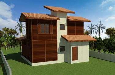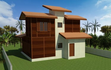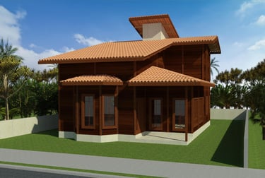 Com 104,01 m², o projeto Oregon é um sobrado compacto e elegante. Conta com dois dormitórios, uma suíte, sala íntima e varandas que integram os ambientes com o exterior, tudo em madeira maciça de Massaranduba.